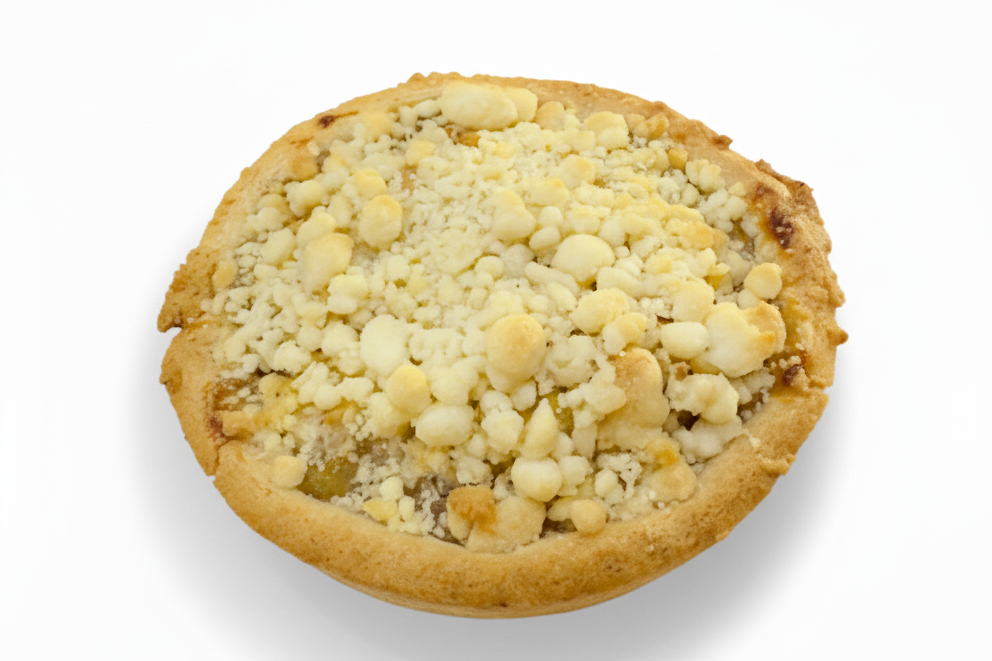 Our Apple Crumble Pie features fresh, juicy green apples beneath a rich, buttery crumble topping made with egg, milk, and butter. Baked to a golden crisp, this pie combines the natural sweetness of apples with a soft, crumbly texture for a classic, comforting dessert experience. Perfect for any occasion or a cozy treat at home.